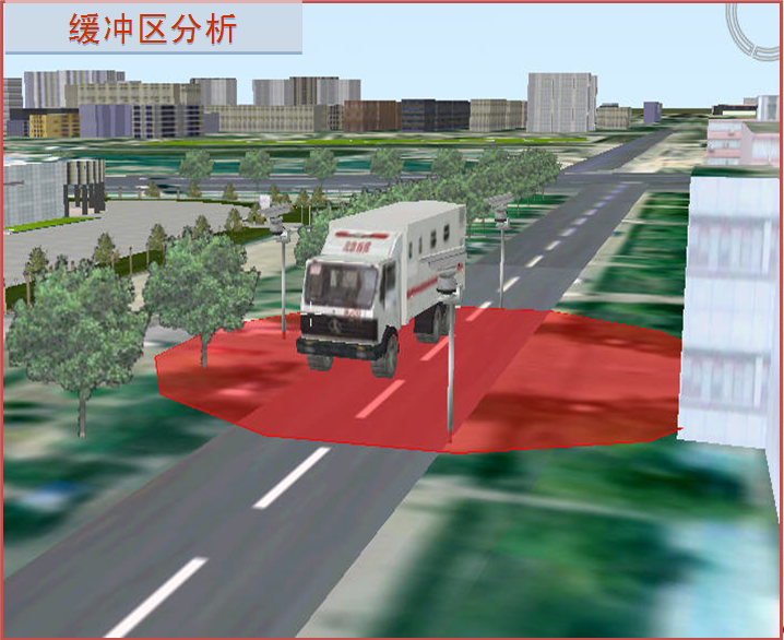 系統是基于三維地理信息系統的,所以可以提供多種高級分析工具。對于危險品運輸車(chē)輛,當其駛入城市范圍內,則進(jìn)入一級警備狀態(tài)。首先對車(chē)載危險源(車(chē)輛運輸的物體:如氣體、液體等)進(jìn)行獲取,采用緩沖區分析方法,建立擴散模型;根據危險品的性質(zhì)及汽車(chē)行駛的路線(xiàn),當車(chē)輛到達事故高發(fā)區時(shí),進(jìn)行提醒;對可能的事故災害做到提前預警。一旦出現事故,可以迅速安排相關(guān)人員救援、指揮現場(chǎng)群眾有序疏散等,采取有效措施,積極應對。