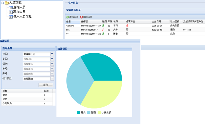 人口管理是社區工作的主要部分,包括常住人口、暫住人口、流動(dòng)人口、重點(diǎn)人口等。如何科學(xué)有效的對這些人口進(jìn)行統計、分析、查詢(xún)等,是社區工作的重點(diǎn)。產(chǎn)品提供的人口管理模塊,可以實(shí)現對各類(lèi)人口的分類(lèi)查詢(xún)、統計分析等功能,實(shí)現對人口的可視化、科學(xué)化管理。
