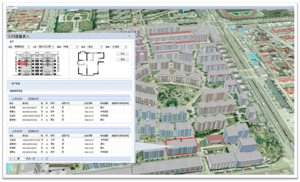 通過(guò)將人口信息與三維場(chǎng)景中房屋模型信息進(jìn)行關(guān)聯(lián)管理,一方面可以“以人定房”,實(shí)現人員定位,查找到社區特殊人員住所;一方面可以“以房找人”,通過(guò)查詢(xún)三維系統中的建筑物,可以統計相關(guān)人員的分布。人房有三種常見(jiàn)關(guān)系:住戶(hù)關(guān)系、租戶(hù)關(guān)系和商戶(hù)關(guān)系。通過(guò)建立人員和房屋的關(guān)系,實(shí)現將人員精確到房間的管理粒度。在三維場(chǎng)景中通過(guò)框選、點(diǎn)選、圈選社區內的建筑物,可以將建筑物內每個(gè)單元、樓層、甚至具體到房間內的各類(lèi)人員進(jìn)行統計、查詢(xún)、定位。例如:查詢(xún)建筑物內的殘疾人,所有居住殘疾人的房間會(huì )高亮度顯示。實(shí)現人口數據與GIS空間信息的結合。對轄區內出租房屋以房屋所有人為核心進(jìn)行登記管理,全面掌握出租房屋的所有人、居住人員信息以及房屋情況,對轄區內出租房屋進(jìn)行嚴格管理。在三維系統中,可以將轄區內的出租房屋高亮度顯示,并對房屋內居住人員信息進(jìn)行查詢(xún)。
