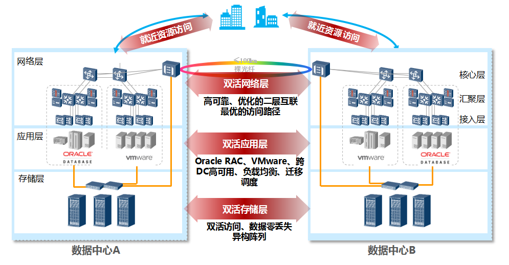 雙活數據中心的定義是指兩個(gè)生產(chǎn)中心共享存儲、網(wǎng)絡(luò )以及服務(wù)器資源,兩個(gè)數據中心同時(shí)對外提供服務(wù),整個(gè)系統具有業(yè)務(wù)負載均衡和自動(dòng)故障切換功能。從維護管理的角度,兩個(gè)數據中心的地位是相同的,都對外提供業(yè)務(wù)(相同的業(yè)務(wù)),屬于雙活數據中心。雙活容災要求,RPO=0,數據零丟失,RTO≈0,容級別達到國標Tier6。雙活依賴(lài)于應用層、數據庫層、網(wǎng)絡(luò )層和存儲層的容災技術(shù)共同協(xié)作才能完成。